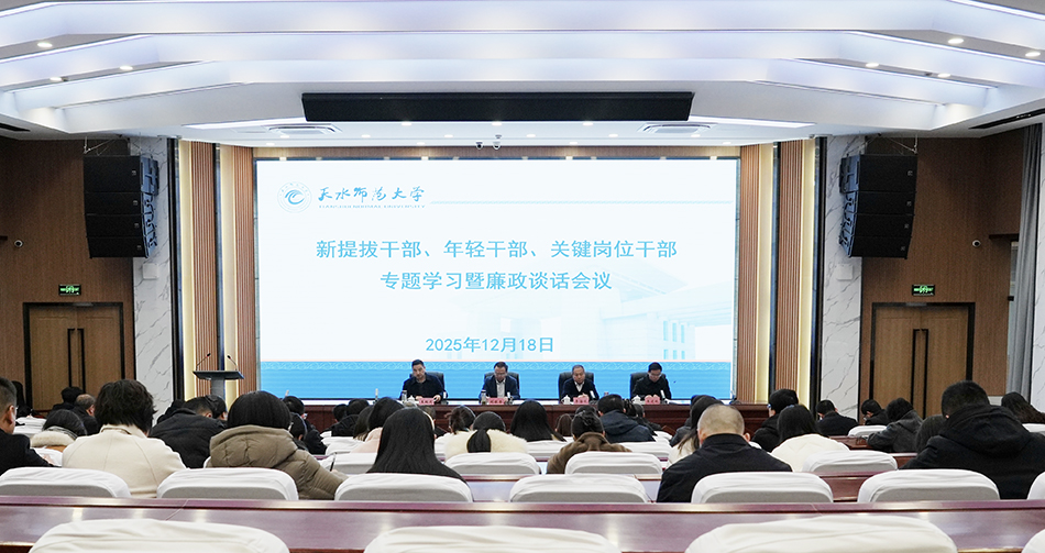 12月18日,天水师范大学召开新提拔干部、年轻干部、关键岗位干部专题学习暨廉政谈话会议。学校党委书记刘振奎出席会议并讲话,党委常委、纪委书记、监察专员王瑞元,党委常委、组织部部长王建斌出席会议。会议由党委副书记李海成主持。