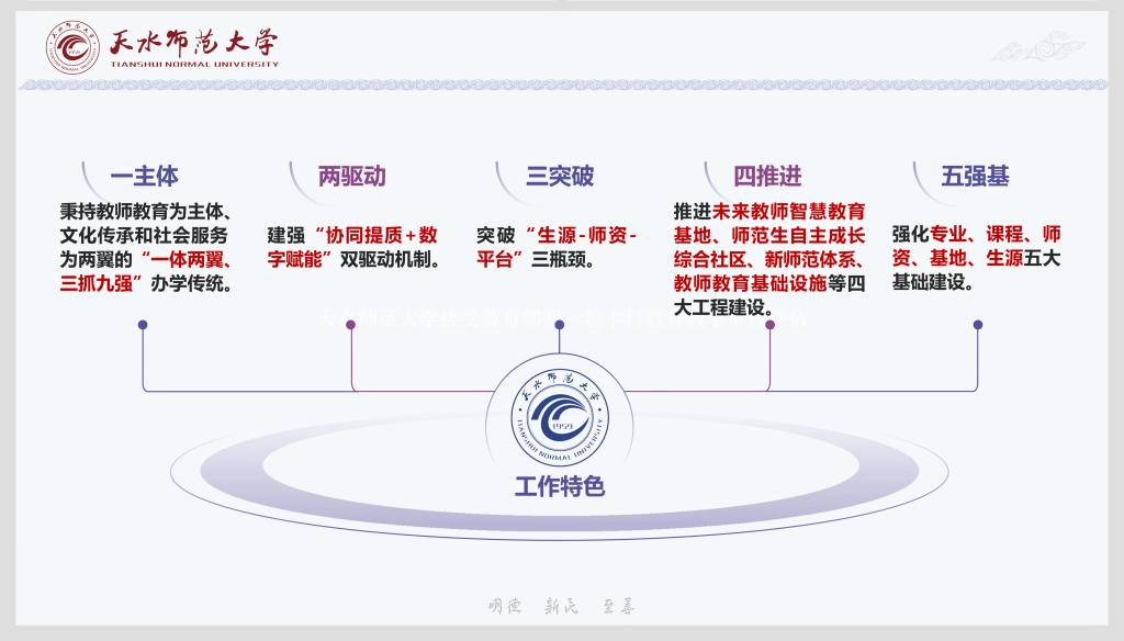 秉承为地方基础教育培养应用型优秀人才的初心使命,立足教师教育人才培养模式创新,学校扎根陇东南,以独特的教育实践书写着“师范强教·教育强国”的时代答卷,构建起“以师范教育为主体,以特色文化传承和特色产业服务为两翼”的办学格局,创新实施“抓师范教育强基础强能力强情怀,抓特色文化传承强品牌强传统强传播,抓特色产业服务强封测强农果强共生”的“三抓九强”行动,驱动学校在服务地方中淬炼成色,走出了一条西部地方高校特色发展之路。《构建“一体两翼”格局 实施“三抓九强”行动——天水师范大学打造西部高等教育新格局》等本科教育教学建设经验被《中国教育报》等宣传推介7次。