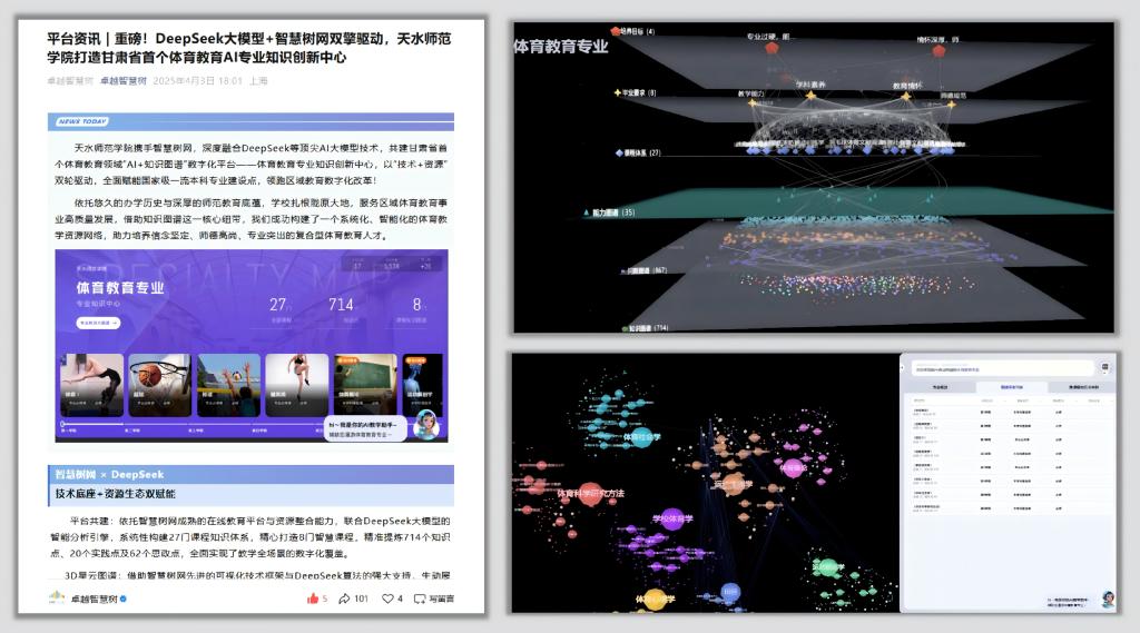 制定《天水师范大学人工赋能教育教学实施方案(2025—2027年)》,成立智慧教育教学研究示范中心,建成甘肃省首个体育教育专业AI知识创新中心,构建“能力目标—问题场景—知识体系—教学资源”四维教学模式,形成“学—练—评”自适应学习闭环。《“AI+知识图谱”数字化平台——体育教育专业知识创新中心》等6个案例入选校级“人工智能+高等教育”典型应用场景案例。开展“AI时代助力智慧课程建设新生态”等专题培训活动87场,覆盖18个二级学院,参训师生超6000人次。